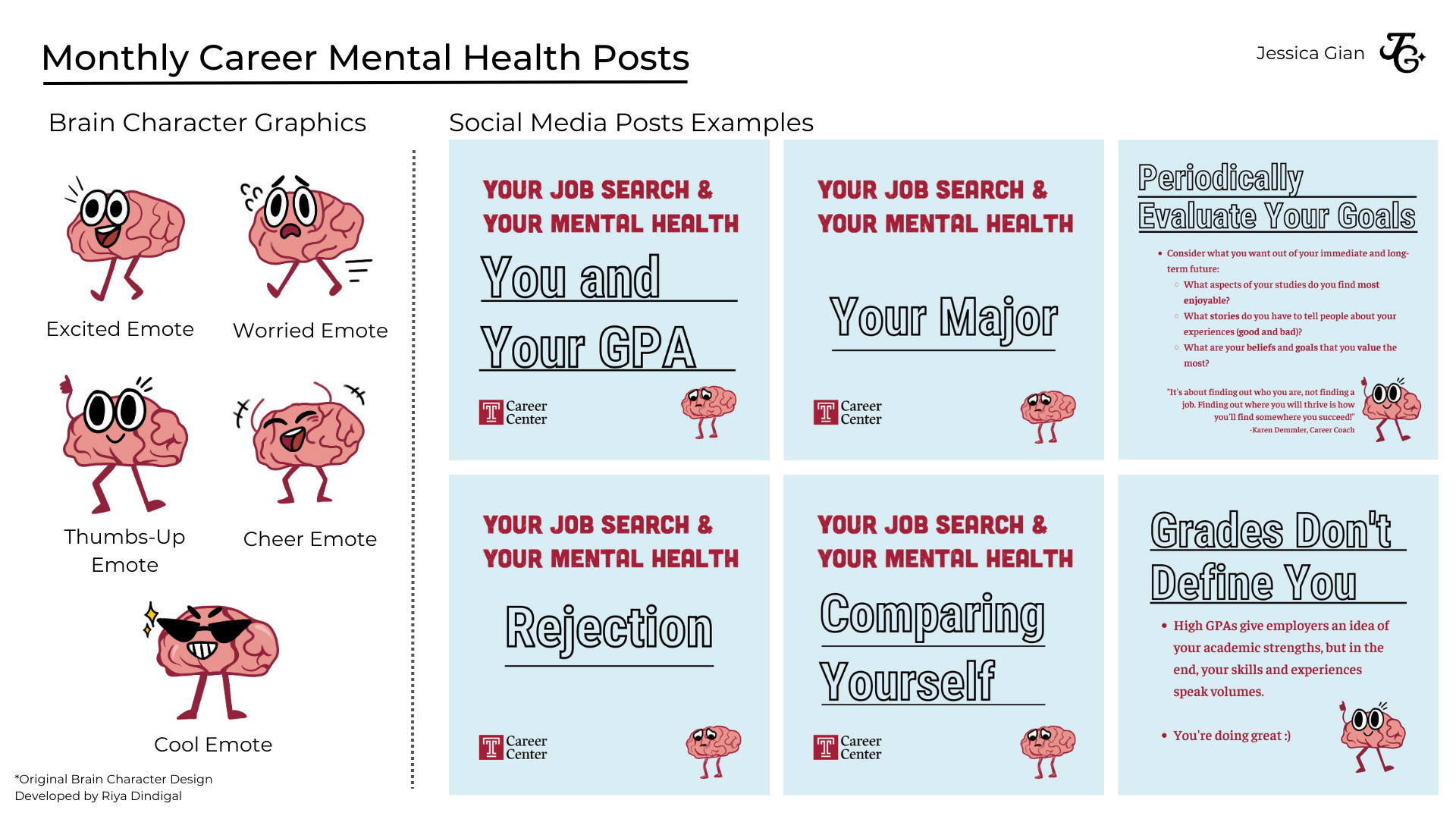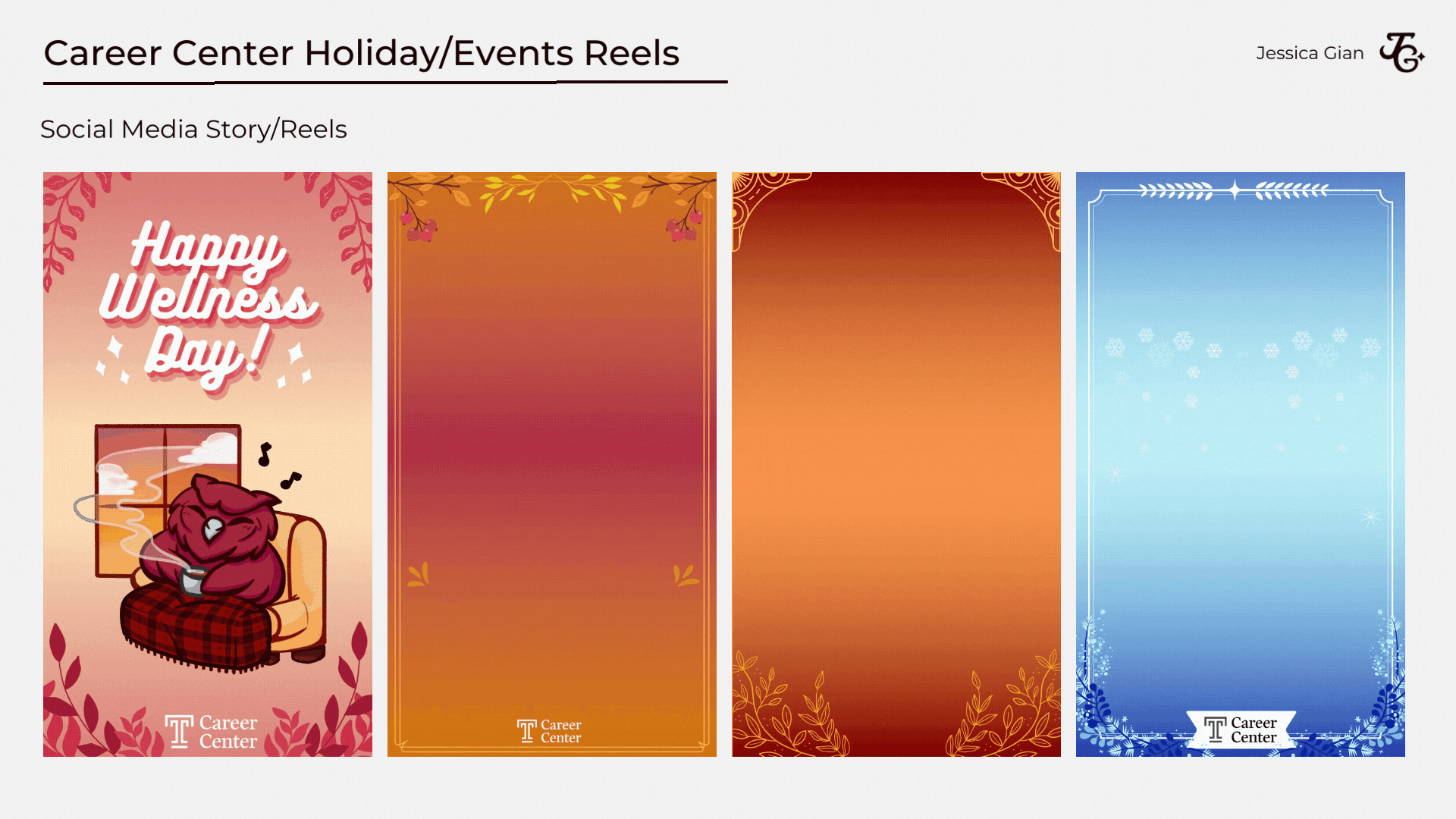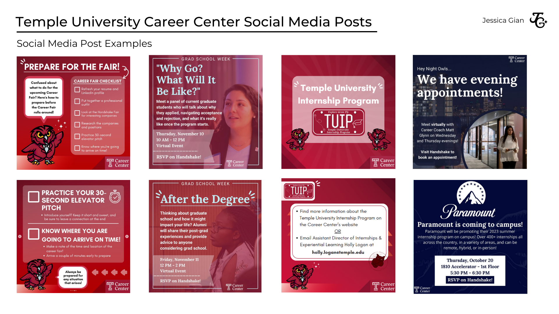 As a Graphic Design and Strategic Marketing Intern at Temple University's Career Center, I designed marketing and social media materials that include synthesizing content and multimedia based on guidelines, participated in collaborative team strategy sessions with members of project management, marketing, and UX strategy, and increased and tracked social media click-through rate and user engagement through all social media platforms.Here are some of the graphics and social media posts below: