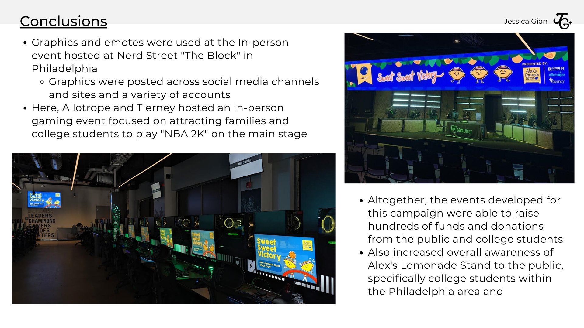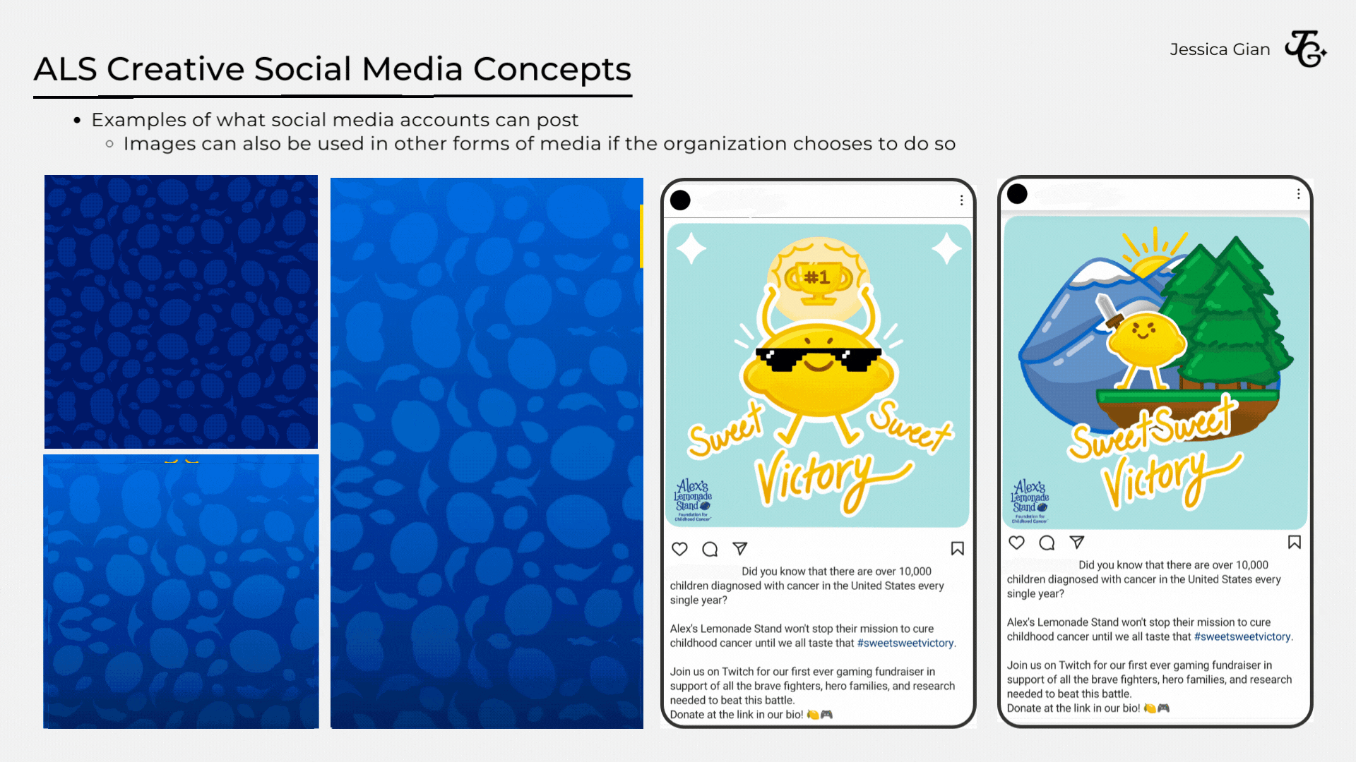 As an Art Director for Allotrope Student Agency, I collaborated with agency members to research and compile information, analytics, and concept designs for clients, utilized design software and media platforms to develop a social media marketing campaign for a charity foundation, and consulted directly with the client to showcase deliverables and concepts that best fit their requests and ideasFor this campaign, we focused on creating a social media campaign and a marketing event for Alex's Lemonade Stand Foundation in collaboration with Tierney.