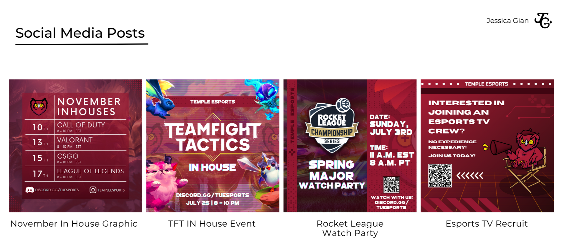 As a Graphic Designer and Content Creator for the Temple Esports Public Relations Team, I helped illustrate and concept design various icons, guidelines, and quality illustrations for Temple Esports' digital platforms, assist the PR Lead by developing and planning weekly graphics for community in-house events and meetings, and provide design advice to social media managers to improve resources and branding on public social media collegiate platformsHere are some of the graphics below: